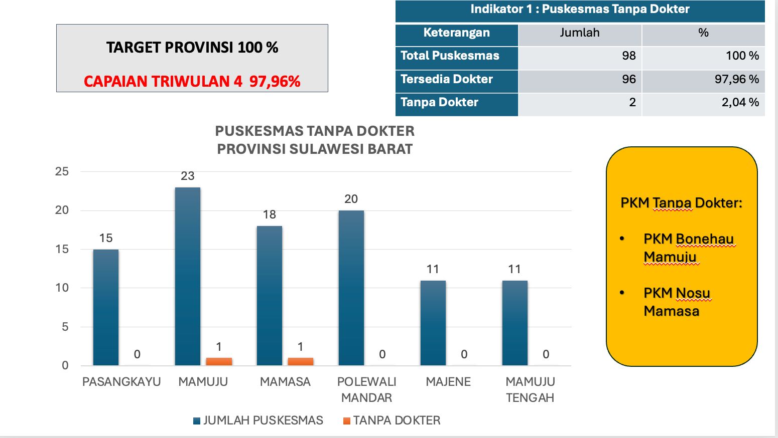 Berdasarkan data terbaru, hanya 2 Puskesmas (2,04 persen) yang masih belum memiliki dokter. Sementara itu, Kabupaten Pasangkayu, Polewali Mandar, Majene, dan Mamuju Tengah telah memenuhi kebutuhan dokter di seluruh Puskesmas. Adapun Kabupaten Mamuju dan Mamasa masing-masing masih mencatat satu Puskesmas tanpa dokter.