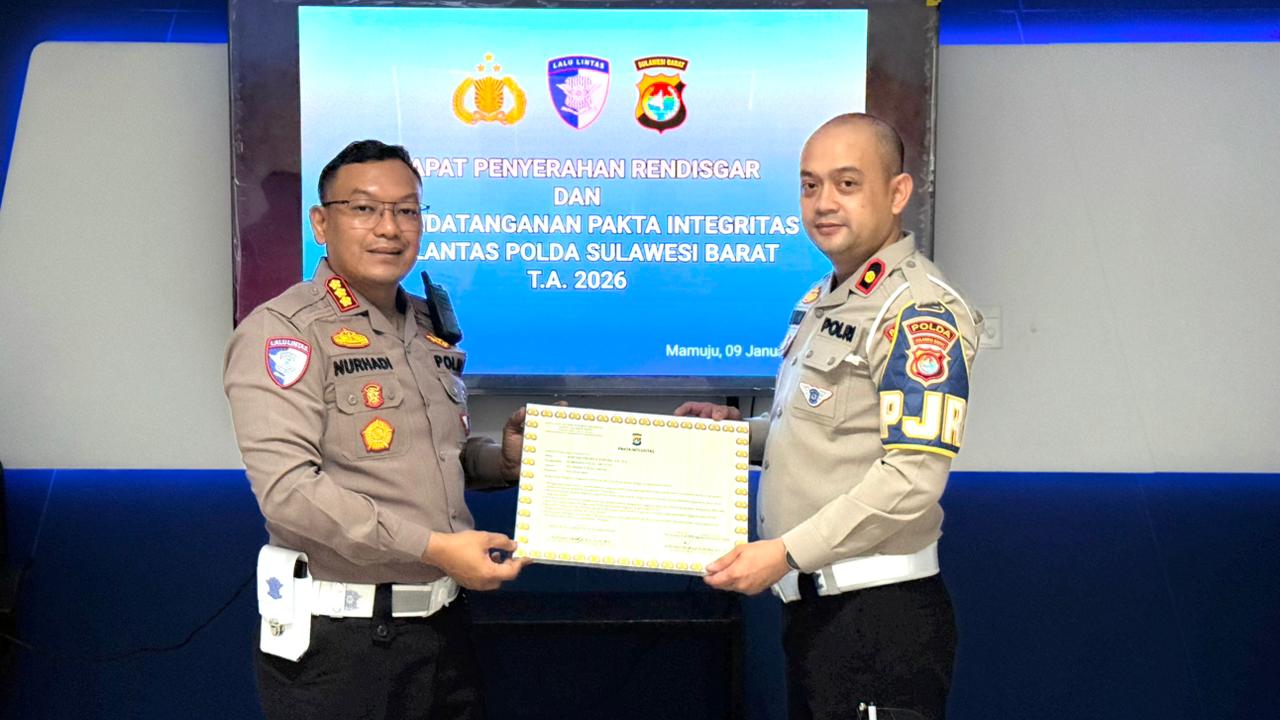 Mamuju, Jurnalsulbar.com — Direktur Lalu Lintas Polda Sulbar Kombes Pol Nurhadi Ismanto dalam rapat penyerahan Rendisgar dan penandatangan pakta integritas bagi seluruh Subdit jajaran Direktorat Lalu Lintas (Ditlantas) Polda Sulbar menekankan pentingnya pengelolaan anggaran yang bertanggung jawab, Jumat (9/1/26) di Aula Kantor BPKB.