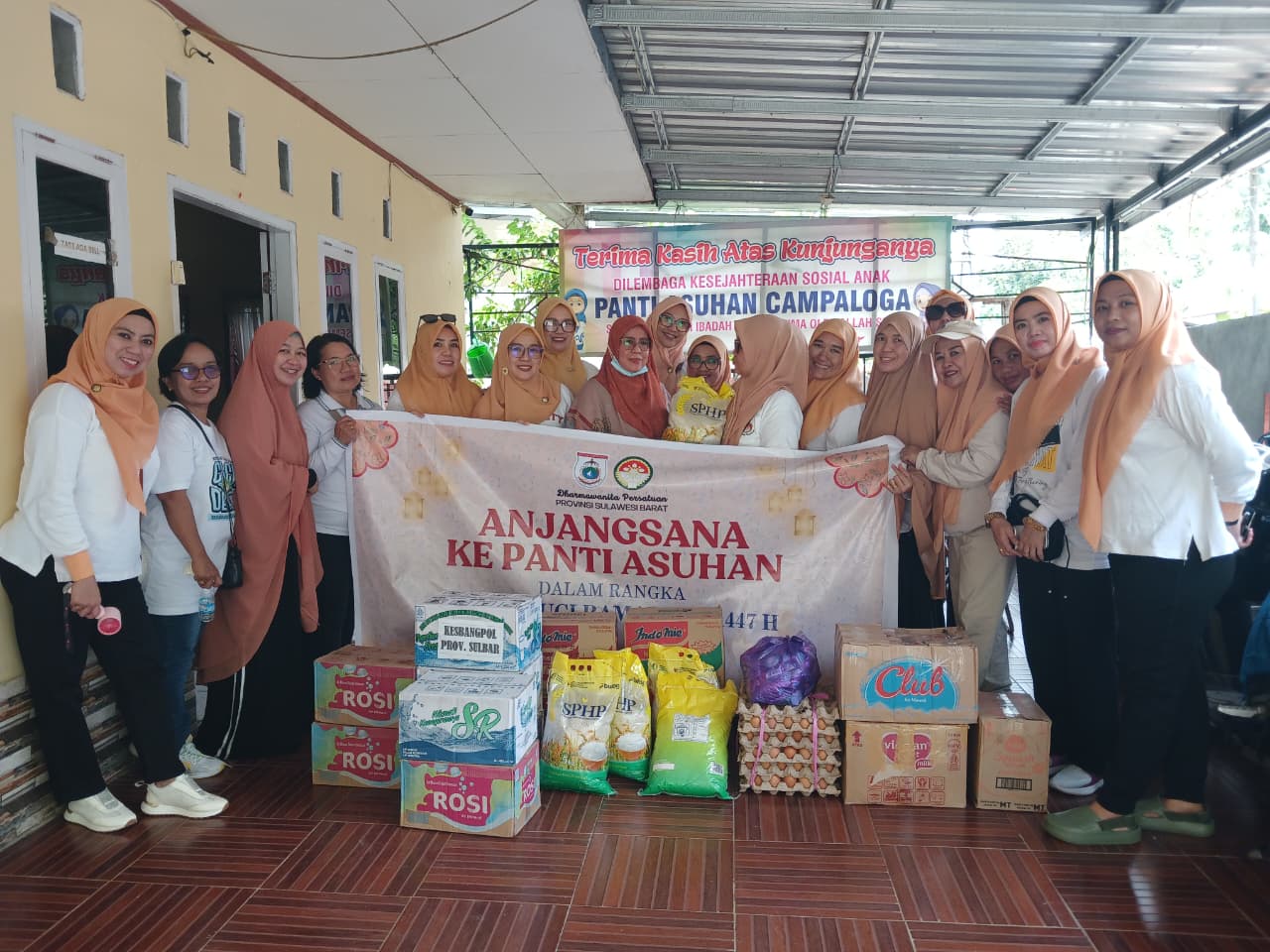 Dalam kegiatan tersebut, DWP Provinsi Sulawesi Barat menyerahkan bantuan berupa sembako, perlengkapan mandi, serta perlengkapan ibadah seperti mukena dan sarung kepada seluruh anak-anak penerima manfaat di masing-masing panti asuhan.