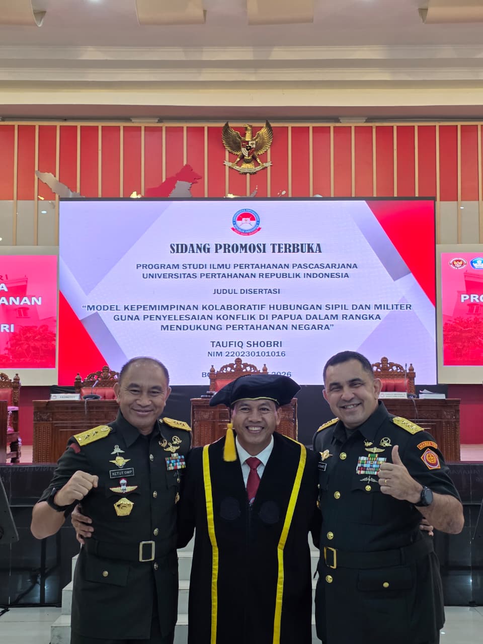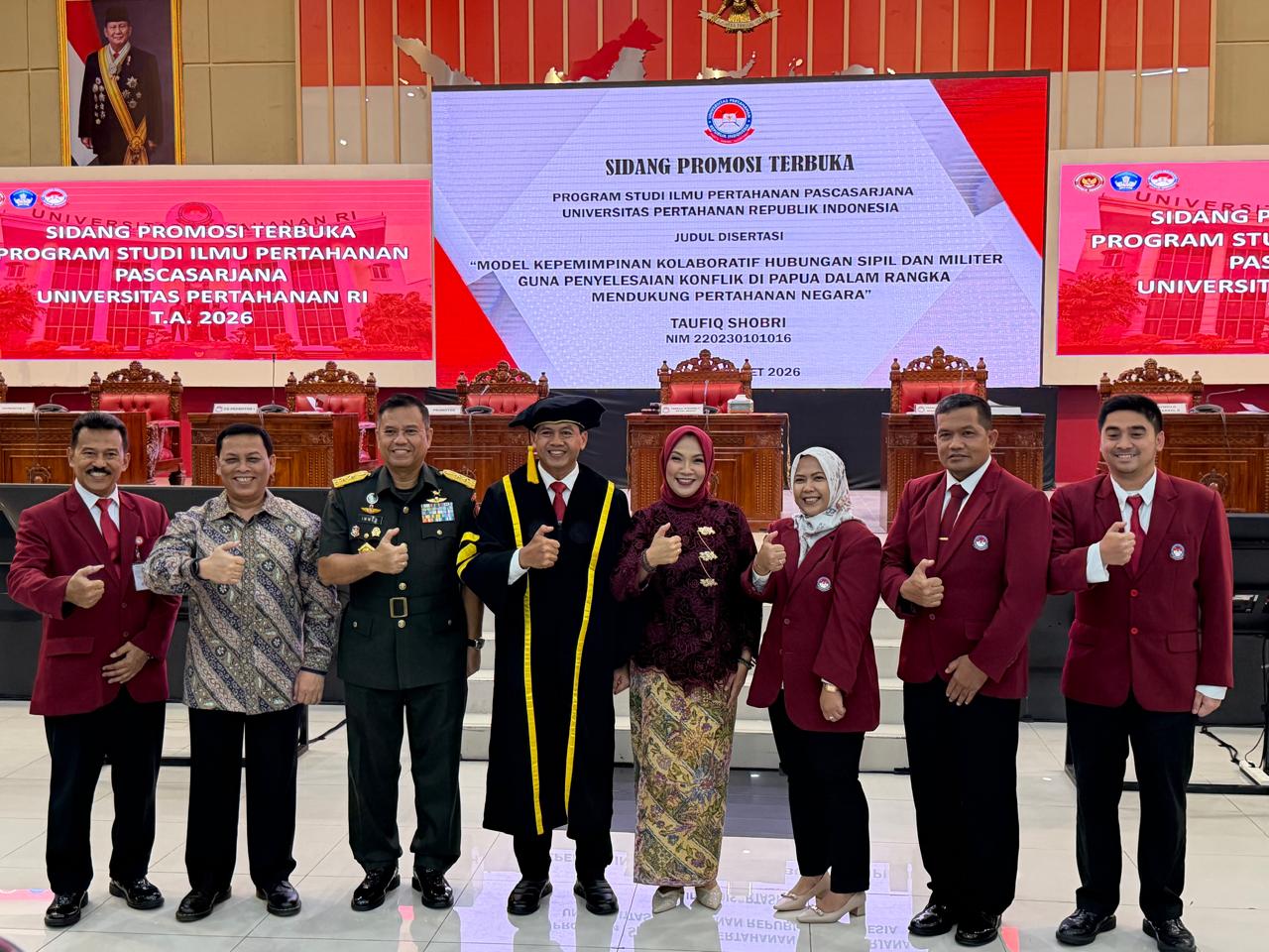 Dalam sidang terbuka tersebut, Taufiq Shobri yang mengambil konsentrasi Manajemen Pertahanan, memaparkan disertasi dengan judul “Model Kepemimpinan Kolaboratif Hubungan Sipil dan Militer guna Penyelesaian Konflik di Papua dalam rangka Mendukung Pertahanan Negara”.