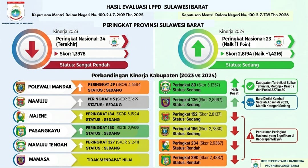 Posisi ini menunjukkan bahwa kinerja penyelenggaraan pemerintahan daerah di Provinsi Sulawesi Barat masih berada pada kategori menengah, sehingga diperlukan upaya peningkatan yang lebih optimal guna memperbaiki capaian di masa mendatang.