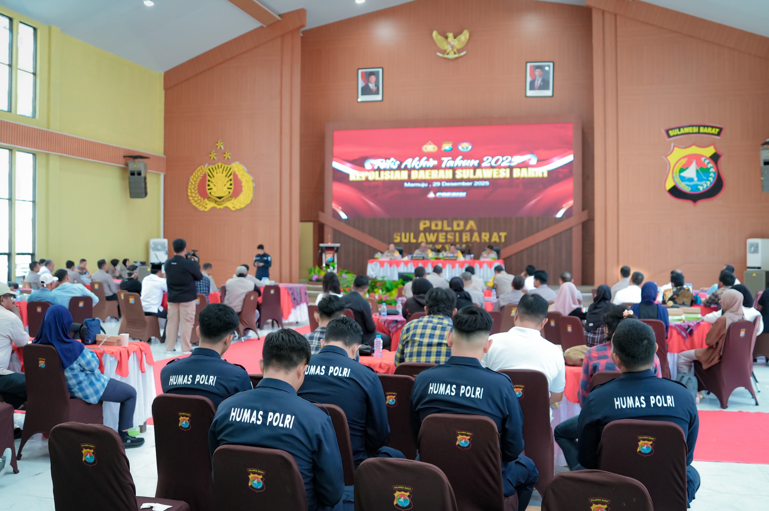 Mamuju, Jurnalsulbar.com — Dalam kegiatan rilis akhir tahun, Kapolda Sulbar Irjen Pol Adi Deriyan Jayamarta memaparkan capaian prestasi pada penanganan kasus kejahatan hingga lalu lintas, prestasi dan punishment serta inovasi pelayanan kepada masyarakat sepanjang tahun 2025, Senin (29/12/25) di Aula Marannu.