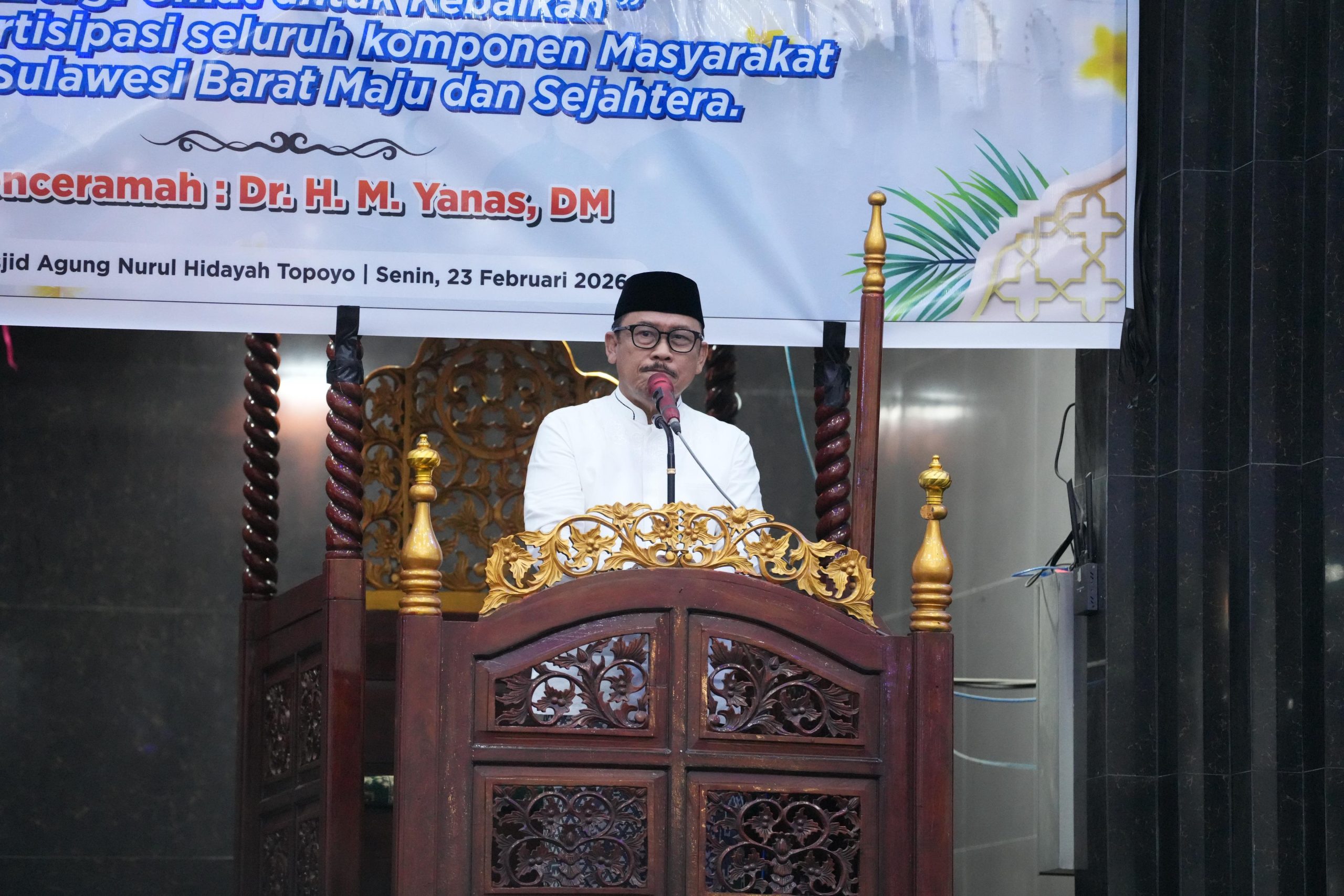 Mamuju Tengah, Jurnalsulbar.com — Gubernur Sulawesi Barat, Suhardi Duka, melaksanakan Safari Ramadan 1447 Hijriah di Masjid Nurul Hidayah Topoyo, Kabupaten Mamuju Tengah, Senin malam (23/2/2026). Kegiatan tersebut menjadi momentum silaturahmi sekaligus penyampaian pesan pembangunan dan kebangsaan kepada masyarakat.