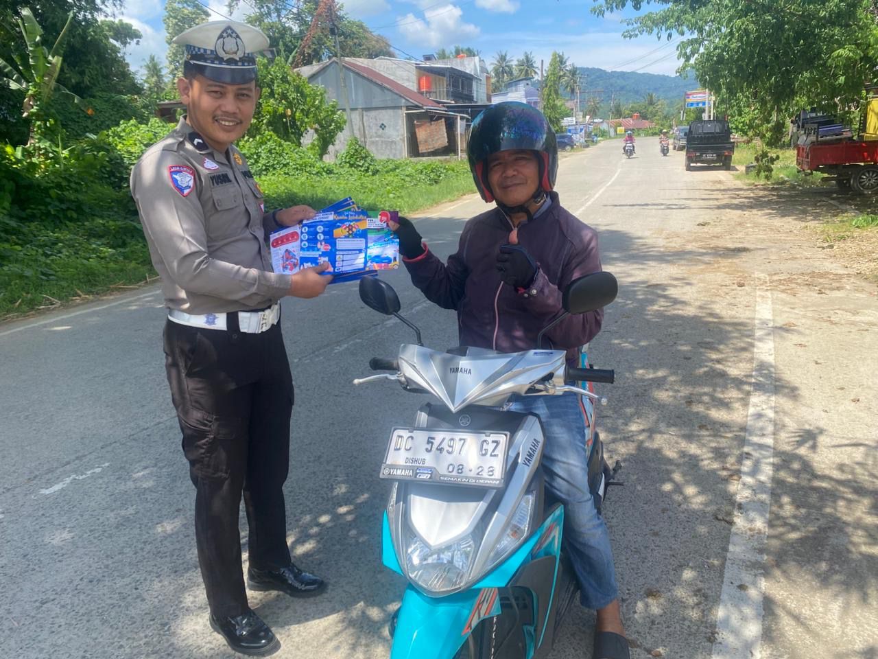 Tidak hanya memberikan sosialisasi, tim Kamsel juga membagikan leaflet dan stiker yang dirancang khusus dengan pesan-pesan inspiratif tentang keselamatan di jalan raya. Setiap pesan yang sampaikan diharapkan dapat menjadi pengingat visual bagi para pengguna jalan untuk selalu berhati-hati dan mematuhi peraturan lalu lintas.